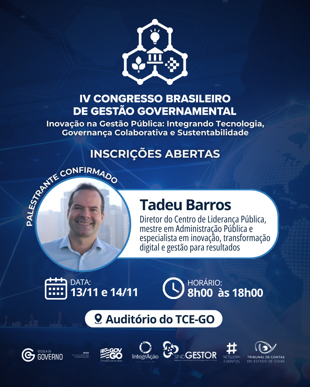 O diretor do Centro de Liderança Pública (CLP), Tadeu Barros, é um dos palestrantes confirmados do IV Congresso Brasileiro de Gestão Governamental, que será realizado pelo Sindicato dos Gestores Governamentais de Goiás (SindGESTOR), em parceria com a Network Eventos, nos dias 13 e 14 de novembro de 2025, no Auditório Conselheiro José Sebba, no Tribunal de Contas do Estado de Goiás (TCE-GO), em Goiânia.