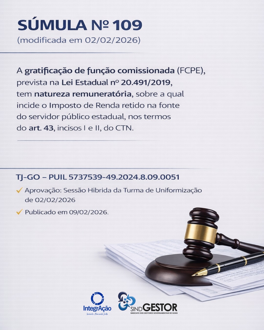 A Turma de Uniformização de Jurisprudência dos Juizados Especiais do Tribunal de Justiça de Goiás (TJ-GO) alterou a súmula sobre a não incidência de Imposto de Renda (IRPF) sobre a Função Comissionada (FCPE) paga aos servidores estaduais. A mudança foi publicada em 9 de fevereiro de 2026 e resultou na reedição da Súmula nº 109.
