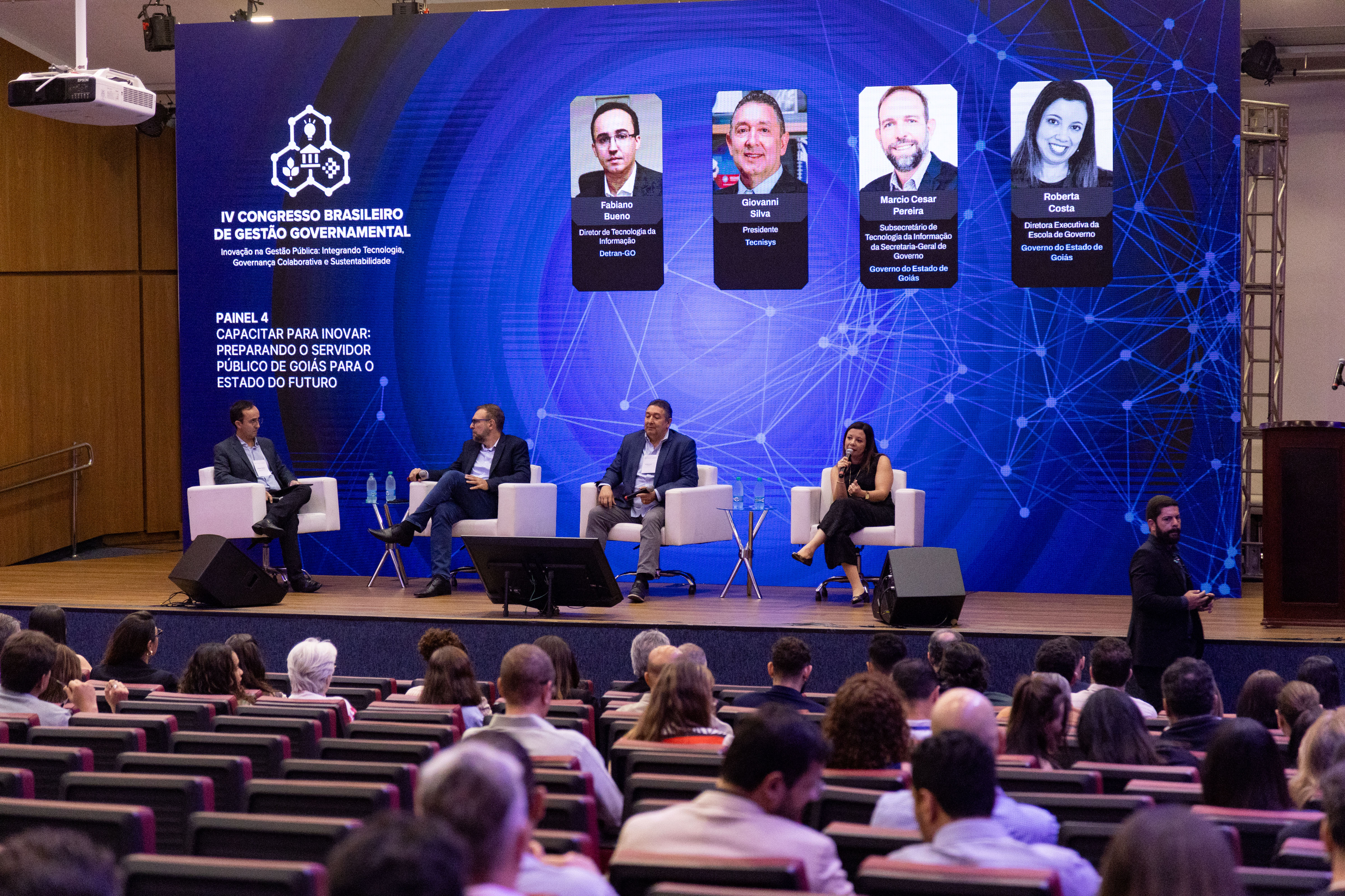 Durante o IV Congresso Brasileiro de Gestão Governamental, o painel “Capacitar para Inovar: Preparando o Servidor Público de Goiás para o Estado do Futuro” reuniu o subsecretário de Tecnologia da Informação da Secretaria-Geral de Governo, Marcio Cesar Pereira; a diretora-executiva da Escola de Governo, Roberta Costa; e o presidente da Tecnisys, Giovanni Silva, para discutir o papel da capacitação na transformação digital do serviço público. A mediação foi realizada pelo gestor de tecnologia da informação e diretor administrativo-financeiro do SindGESTOR, Fabiano Bueno.