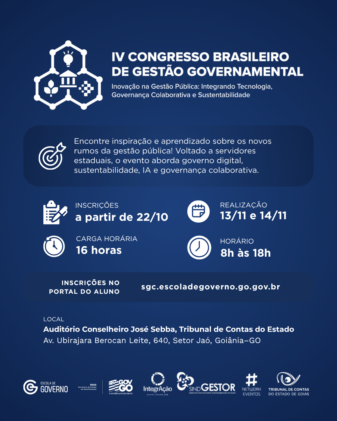 Estão abertas as inscrições para o IV Congresso Brasileiro de Gestão Governamental, promovido pelo Sindicato dos Gestores Governamentais de Goiás (SindGESTOR) em parceria com a Network Eventos. O evento será realizado nos dias 13 e 14 de novembro de 2025, no Auditório Conselheiro José Sebba, no Tribunal de Contas do Estado de Goiás (TCE-GO), em Goiânia.