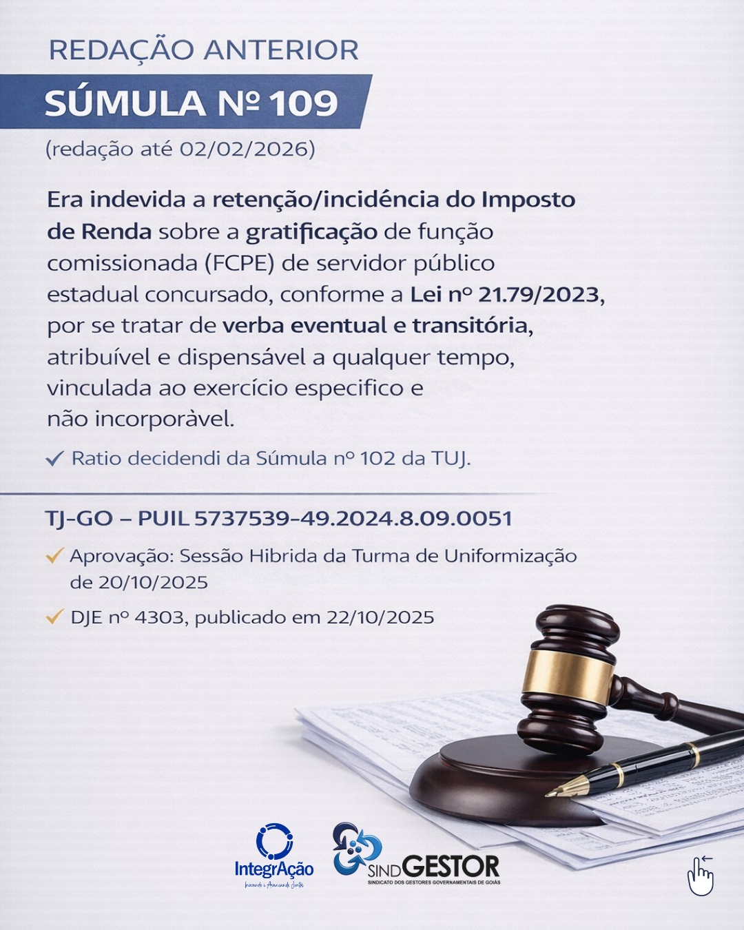 A Turma de Uniformização de Jurisprudência dos Juizados Especiais do Tribunal de Justiça de Goiás (TJ-GO) alterou a súmula sobre a não incidência de Imposto de Renda (IRPF) sobre a Função Comissionada (FCPE) paga aos servidores estaduais. A mudança foi publicada em 9 de fevereiro de 2026 e resultou na reedição da Súmula nº 109.